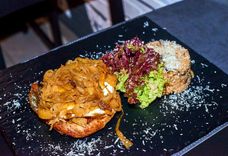 170/200/22 г • Свиная шея, темное пиво, баклажаны, цуккини, грибы, перец сладкий, черри, розмарин, зелень, лист салата