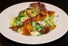 280/2 г • Филе птицы, бекон, картофель, опята, помидор, лук красный, огурец маринованный, соус, зелень
