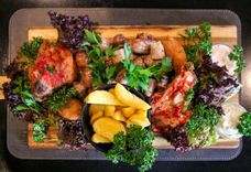 1000/150/35 г • Свиные ребра, куриная голень жареная, колбаса куриная, свиная, говяжья, картофельные дольки, соус тар-тар, соус чесночный, зелень