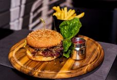 400/150/50 г • Говядина, грудинка, булочка, яйцо куриное, помидор, сыр чеддер, маринованный огурец, листья салата, кетчуп, картофель фри