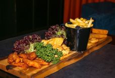 570/100/35 г • Сырные палочки, луковые кольца, нагетсы, кальмар, картофель фри, соус тар-тар, соус чесночный, зелень